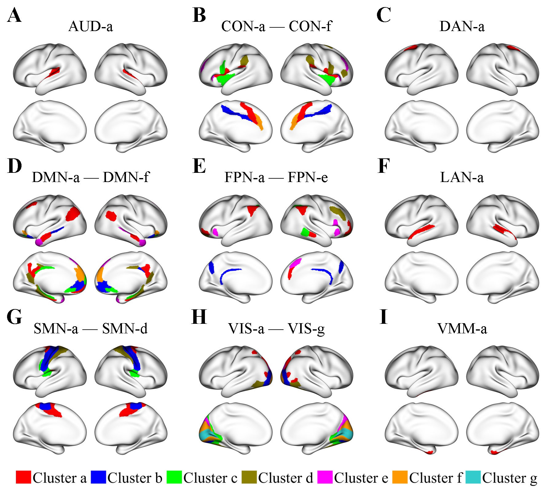 Regions within the same cluster exhibit identical patterns of age-related functional connectivity (FC) changes. Regions with identical FC trajectories generally have the same functions. Yet, regions with the same function may have distinct FC trajectories, as evidenced by clustering results showing that large functional networks are typically divided into smaller region clusters. Here, region clusters are displayed in an organized manner according to their respective functional networks: the auditory network (AUD), the cingulo-opercular network (CON), the dorsal attention network (DAN), the default mode network (DMN), the frontoparietal network (FPN), the language network (LAN), the somatomotor network (SMN), the visual network (VIS), and the ventral multimodal network (VMM). Within each functional network, region clusters are shown in different colors and labeled (e.g., a, b, etc.) in descending order according to their number of regions, from the largest to the smallest.