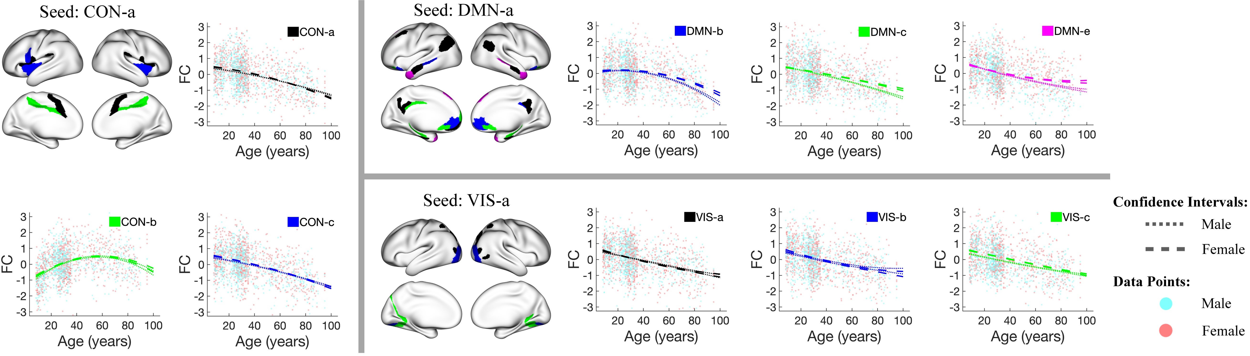 Dotted lines represent 95% confidence intervals for population-mean FC trajectories of males, whereas dashed lines represent those of females.